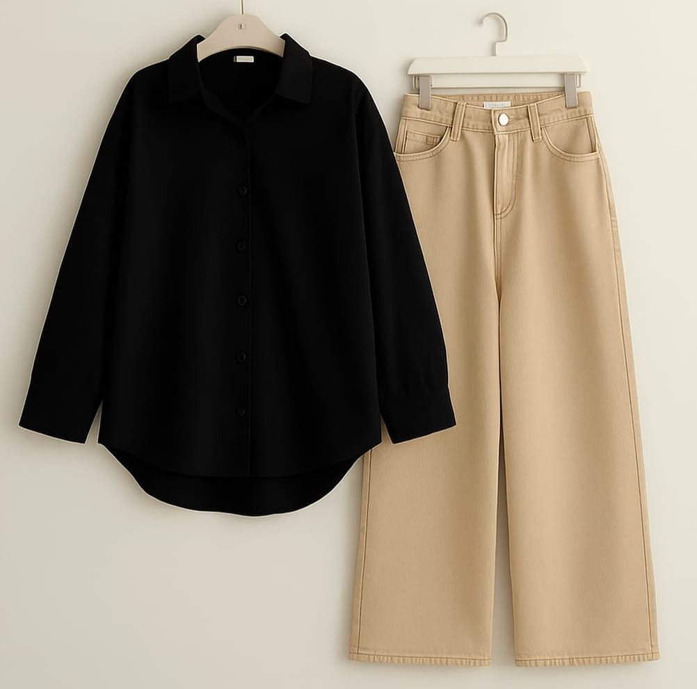 This classic button-down shirt paired with wide-leg jeans delivers a refined yet relaxed style that transitions seamlessly from day to night. The crisp tailoring of the shirt complements the flowy silhouette of the jeans, creating a balanced and elegant look.